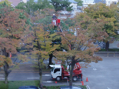 職場の窓から見下ろすと 隣の病院が樹に電飾を施しかけていた クリスマスには遠く,糖尿病デーのためだとか